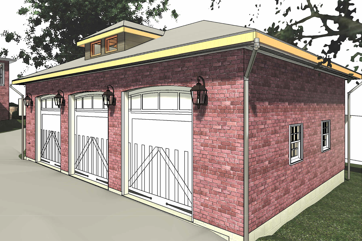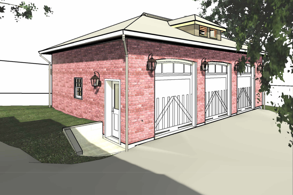 Design of a new detached three-car garage with capacity for up to six vehicles. Each bay will be equipped with a car lift, allowing one vehicle to be stored above another.